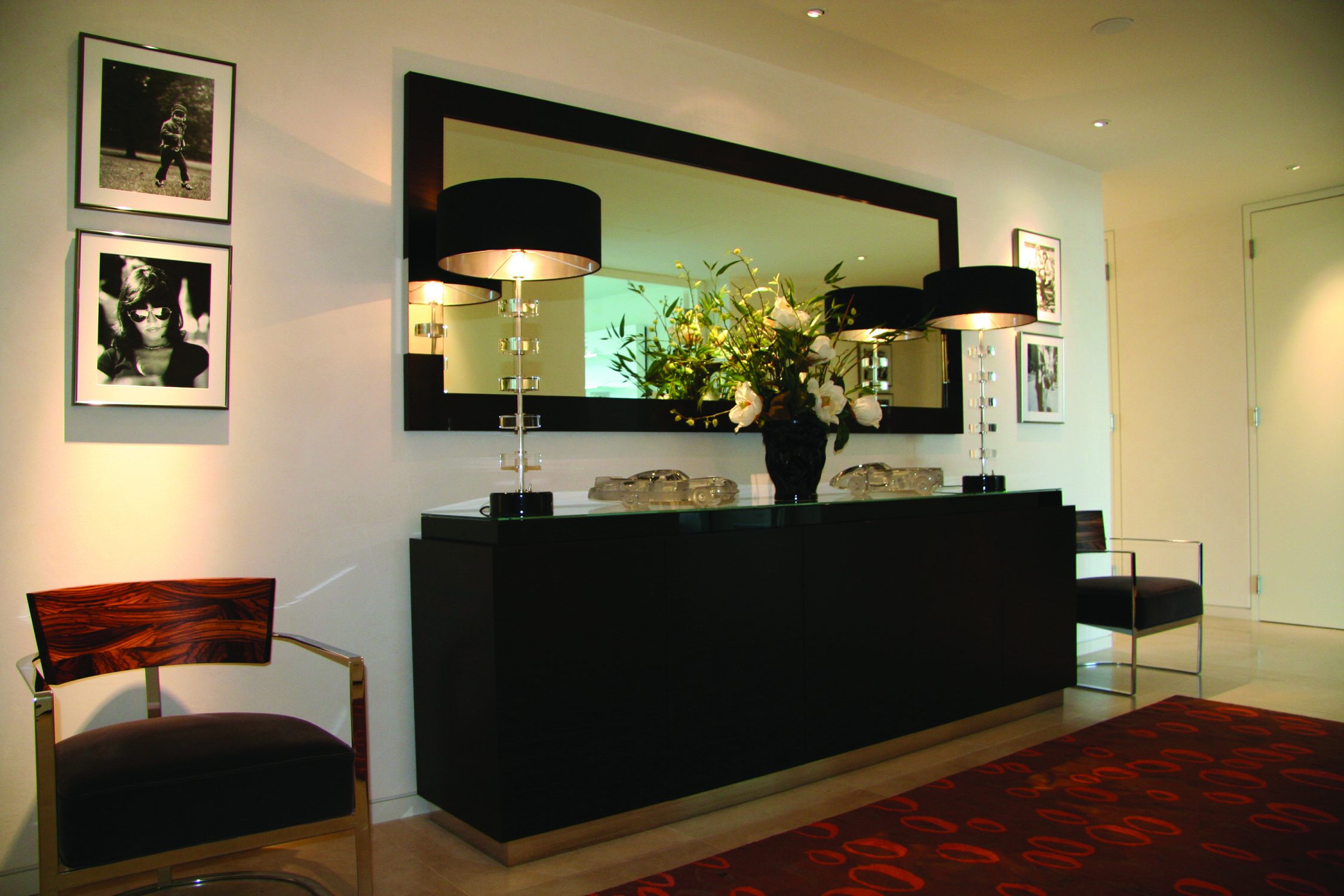 Gloss black lacquer top, stainless steel plinth, walnut interior.