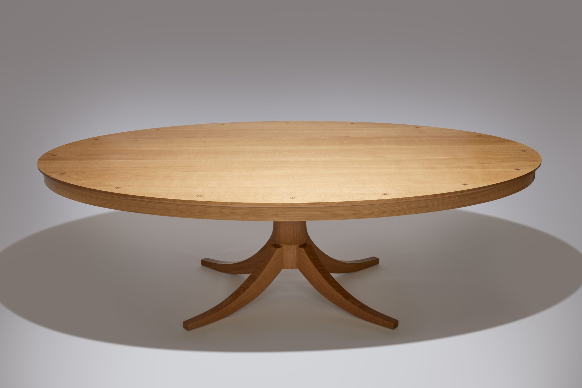 An oval solid oak dining table with walnut star marquetry, a turned base and a natural oil finish.
